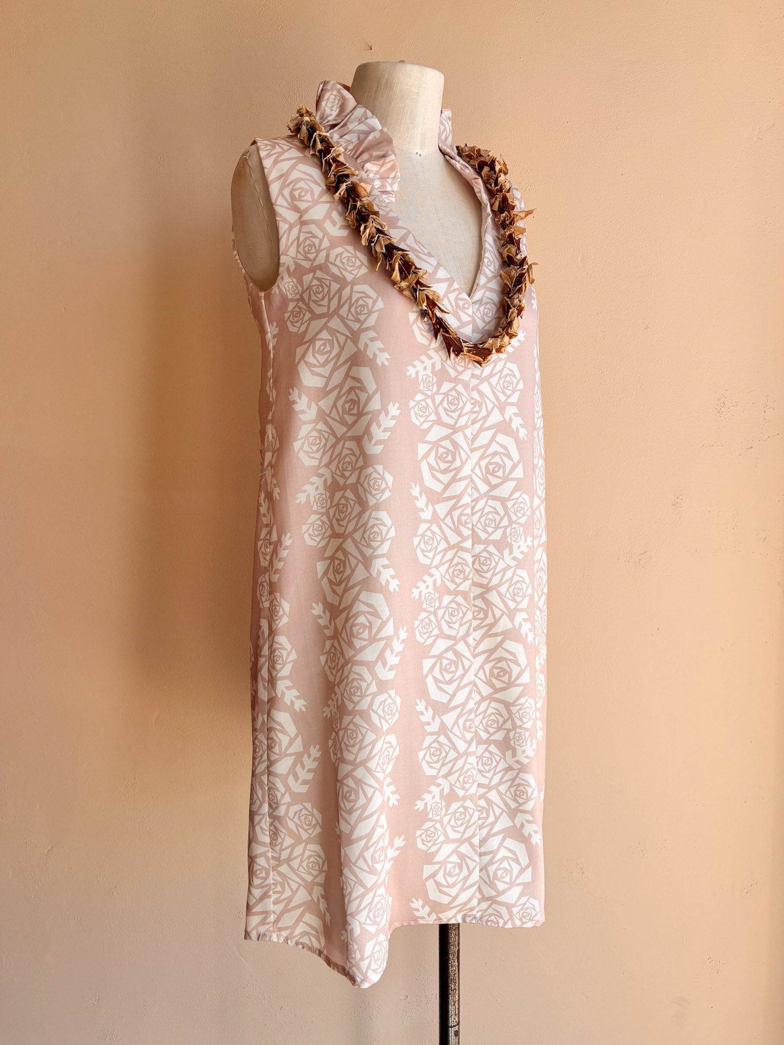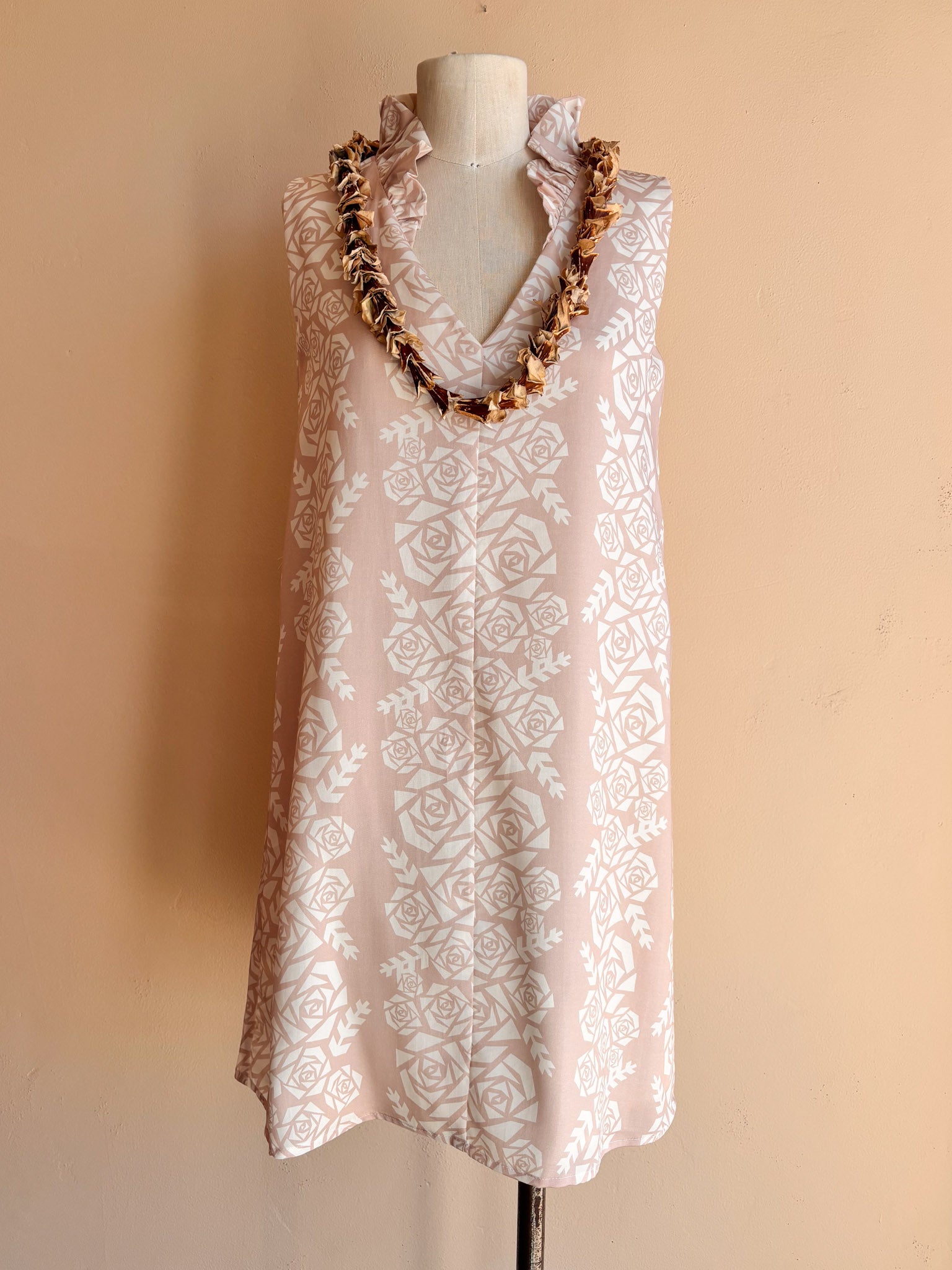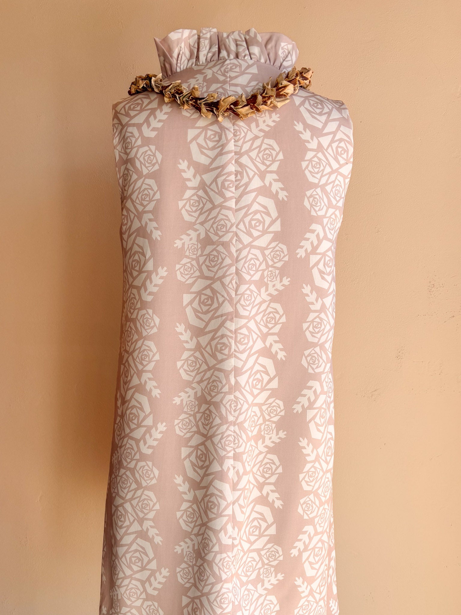 Our signature ruffled collar in a sleeveless, easy cut with v neck. 34" Mini length with pockets. Sizes XS, S, M, L.