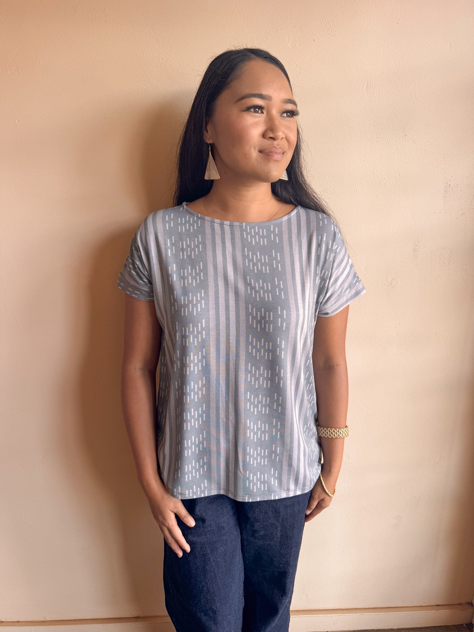 A slightly boxy cut top with a boat neckline and easy fit.  Band at sleeve.  Length to top of hip.  Sizes XS-2X