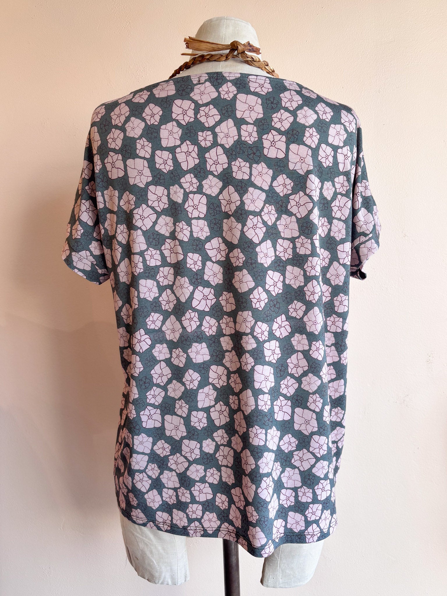 A slightly boxy cut top with a boat neckline and easy fit. Band at sleeve. Length to top of hip. Sizes XS-2X