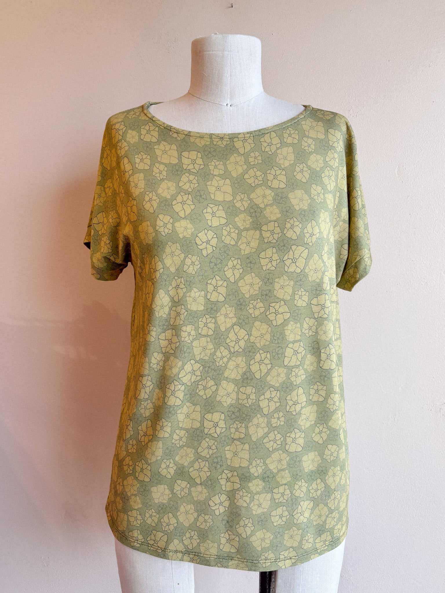 A slightly boxy cut top with a boat neckline and easy fit. Band at sleeve. Length to top of hip. Sizes XS-2X