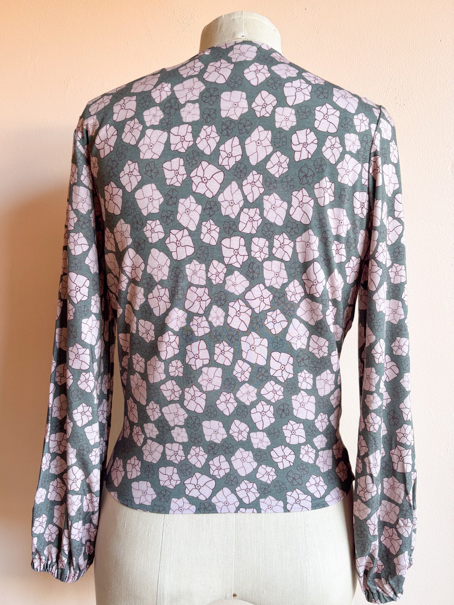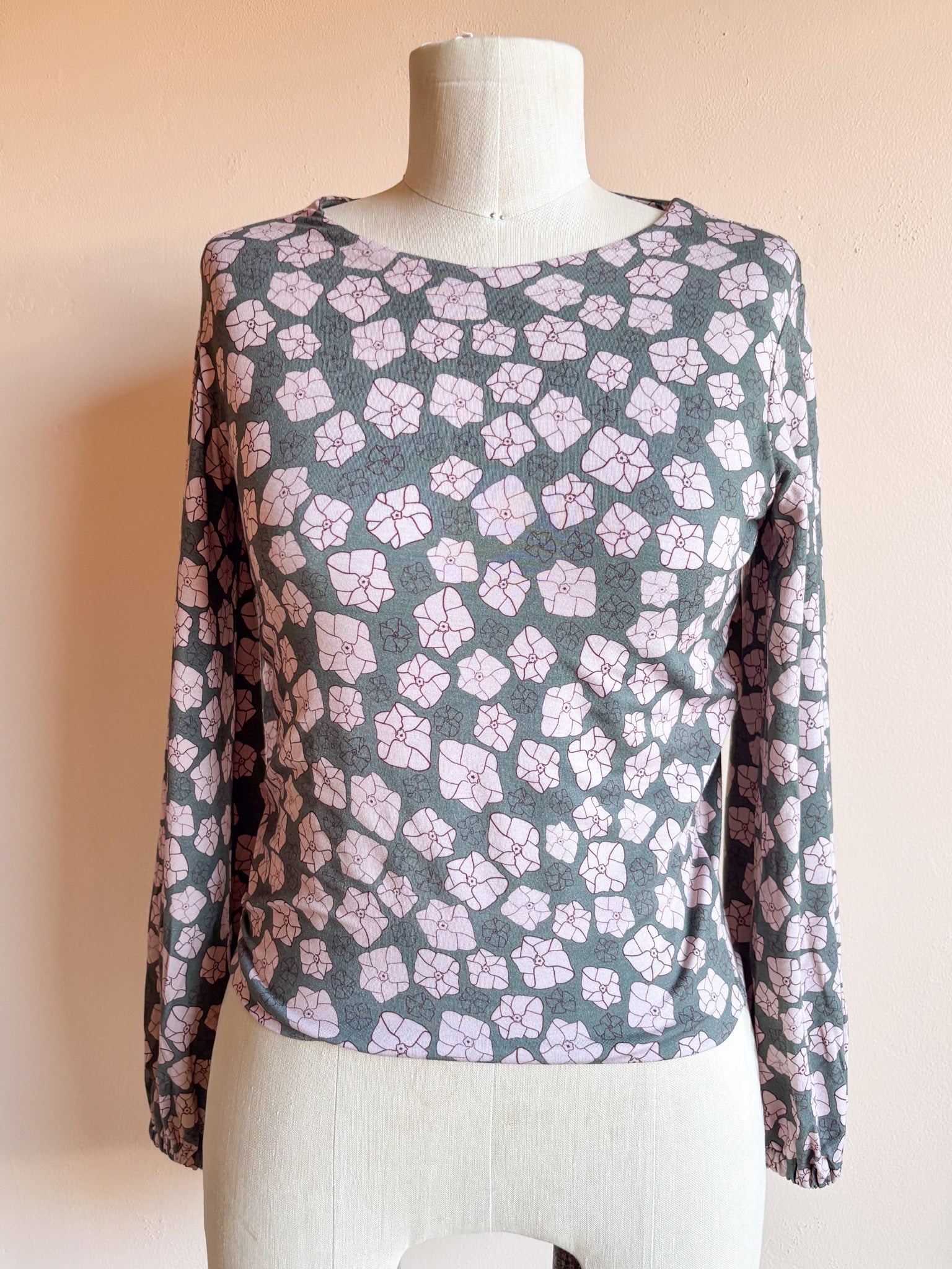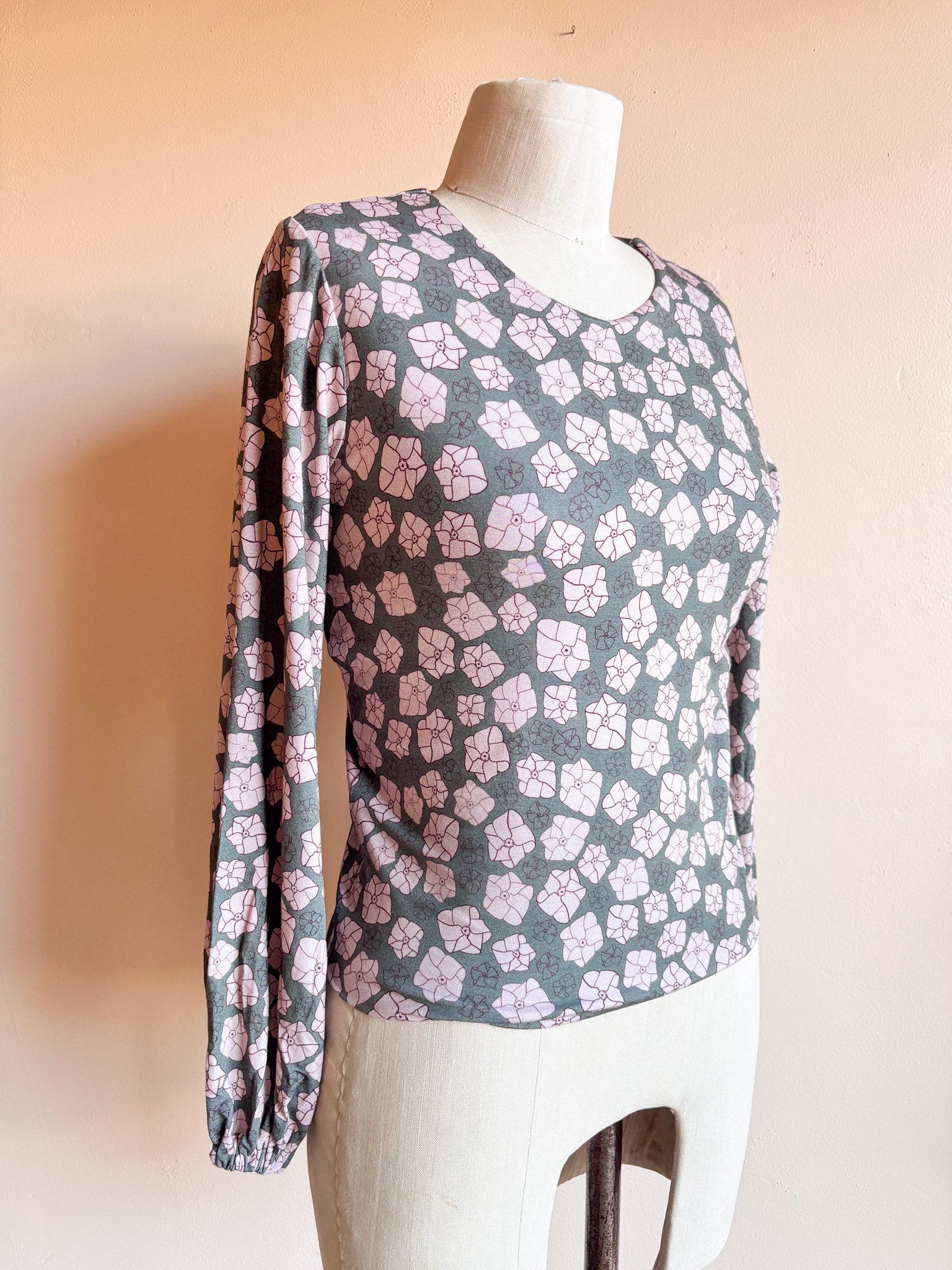 Ipo Top is designed with a crew neck and long, full sleeve with a gathered, stretch cuff.  Body of this top has a double layer and has a close fit.  Length is to the natural waist.