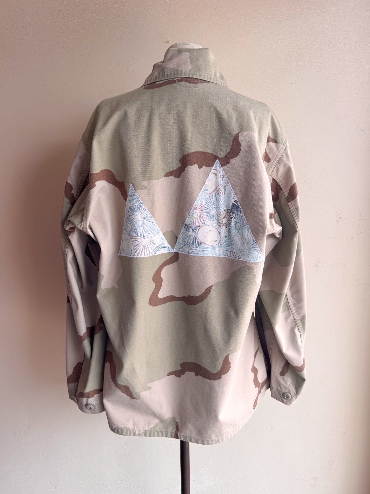 A classic reimagined. Each Upcycled Military Desert Camo Jacket is given new life with the addition of a patch detail in one of Kūlua’s iconic prints. Repurposed from military surplus, every jacket carries its own character—worn-in, storied, and made one-of-a-kind through thoughtful design. The relaxed, unisex fit makes it a versatile layering piece, while the patch transforms it into wearable art, grounding the garment in meaning and place.