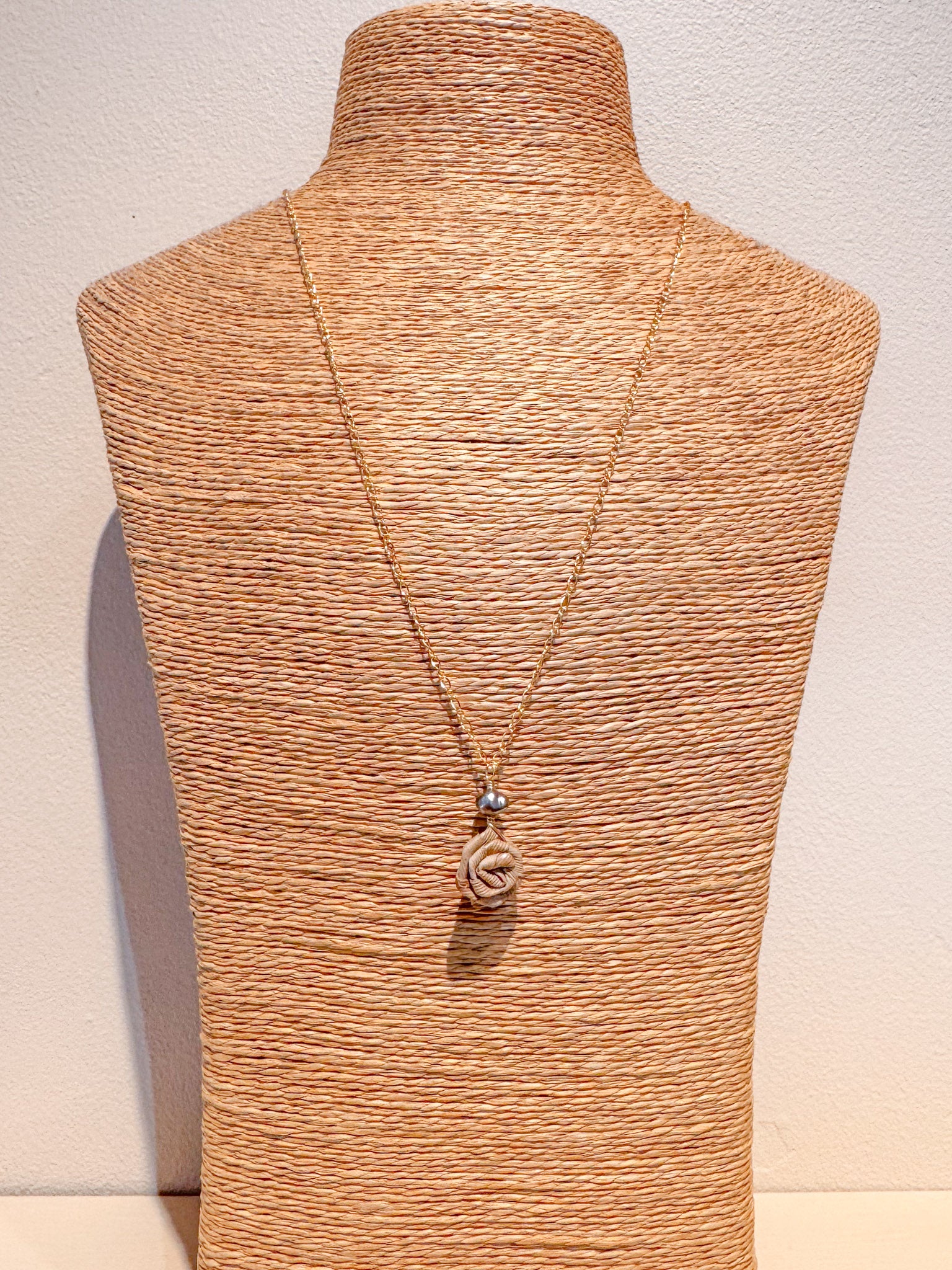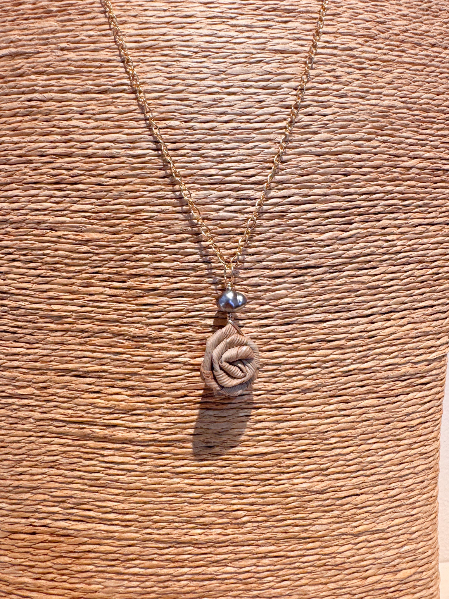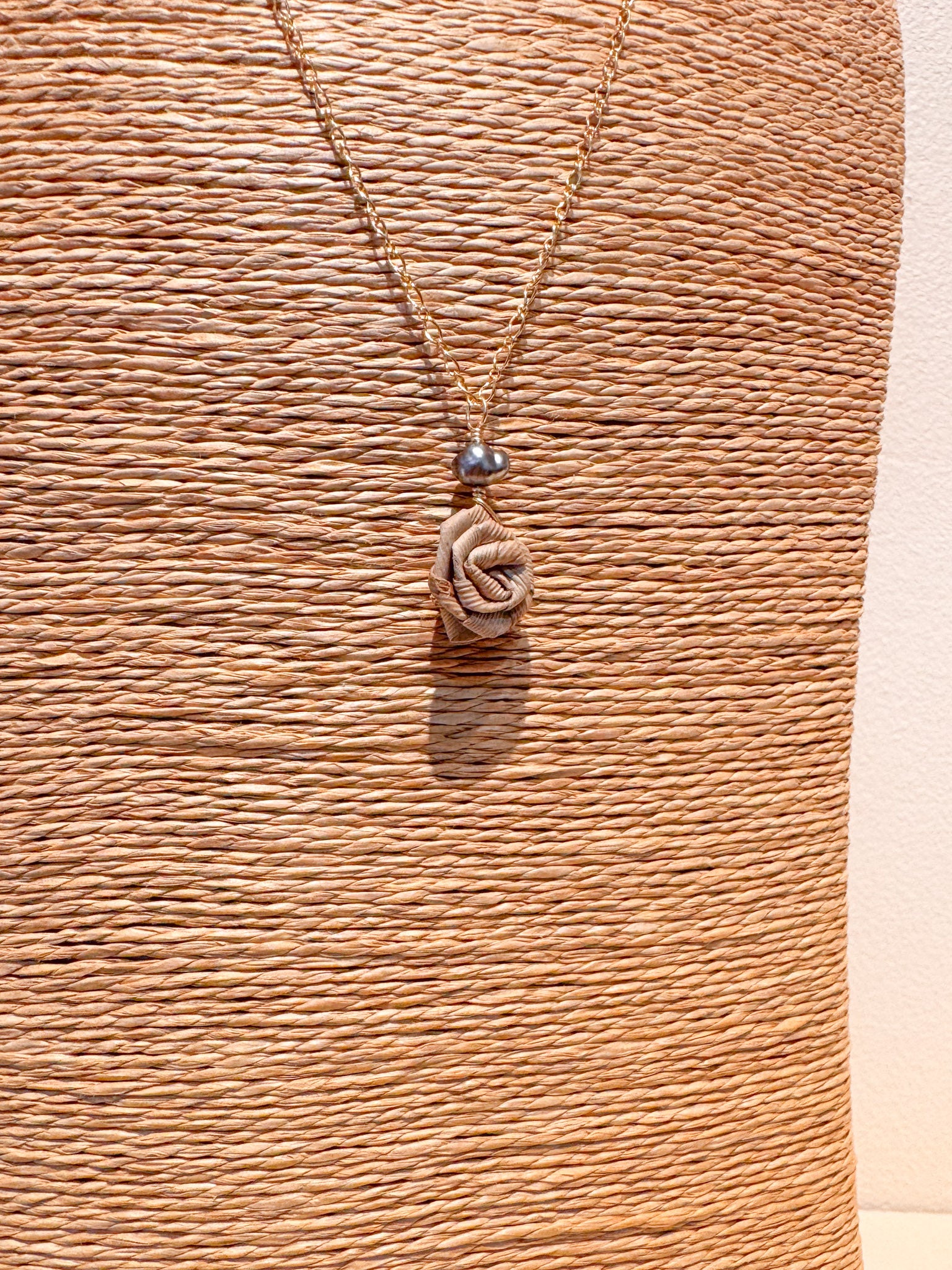 Lauhala Keshi Lokelani necklace with handwoven lauhala rose and a kasha pearl. 20" length. Made on Maui by second generation weaver, Amber King, of Makakulima.