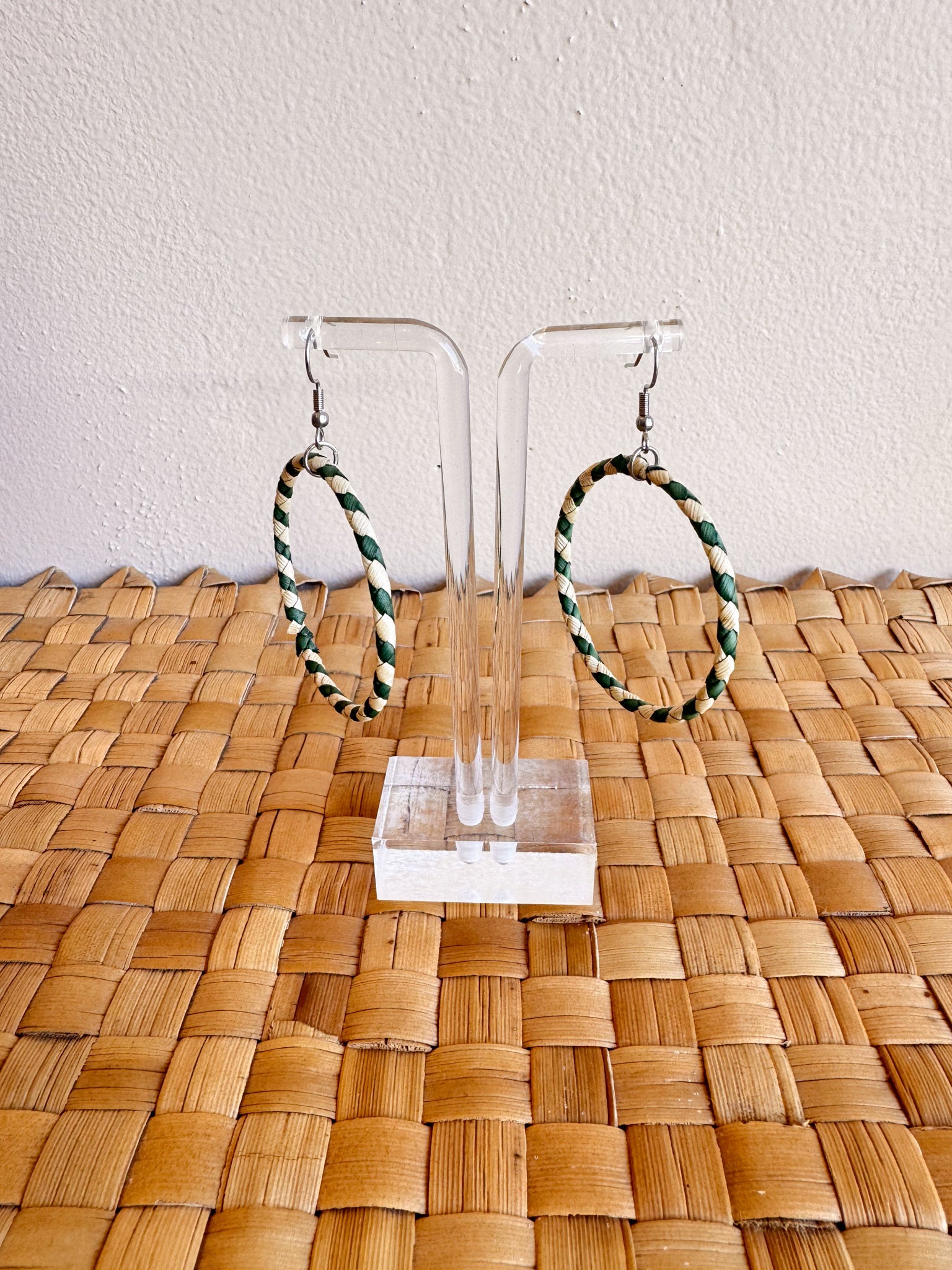 Two-tone hoops with natural and dyed green lauhala. Hypoallergenic sterling silver findings.