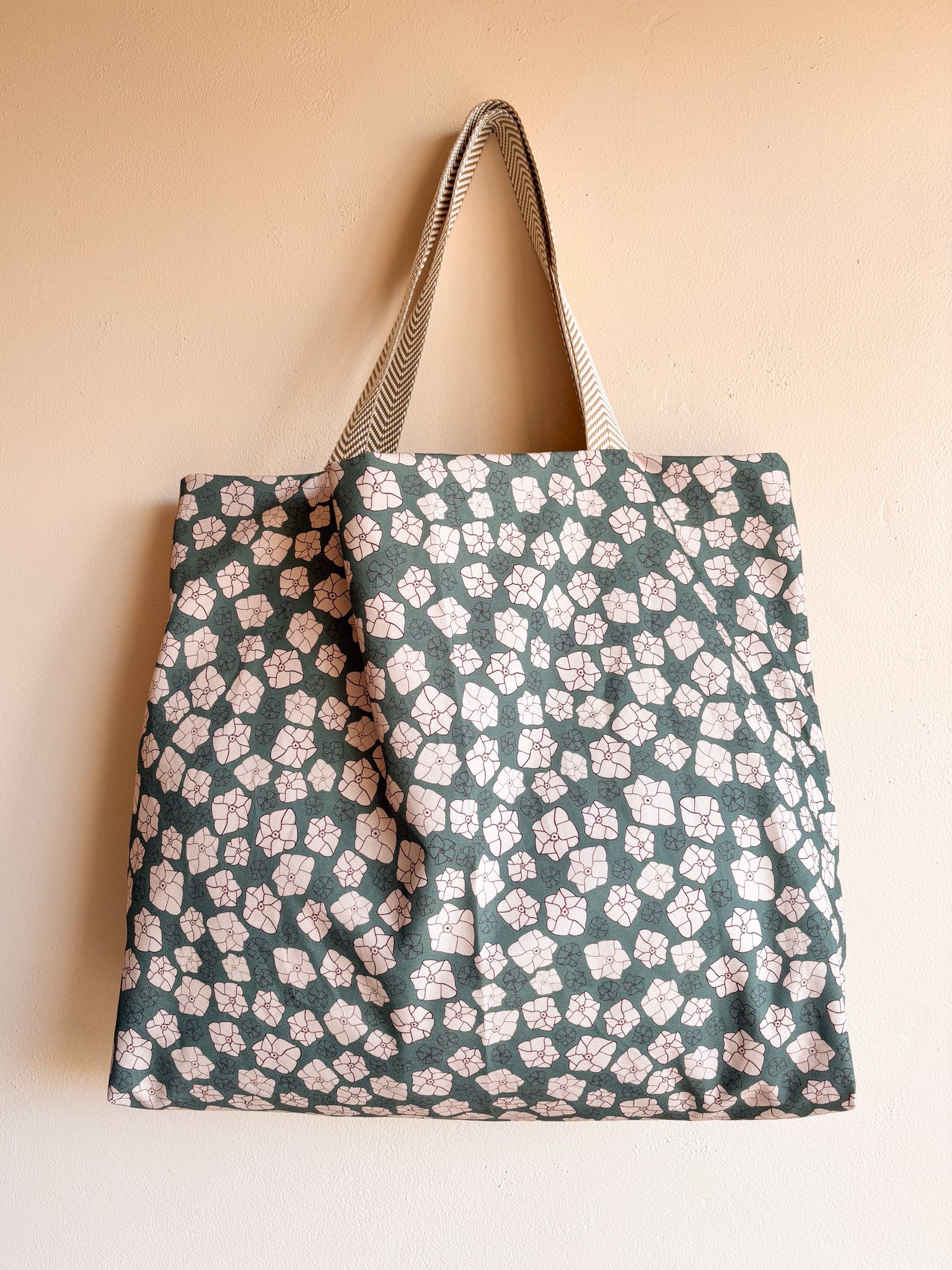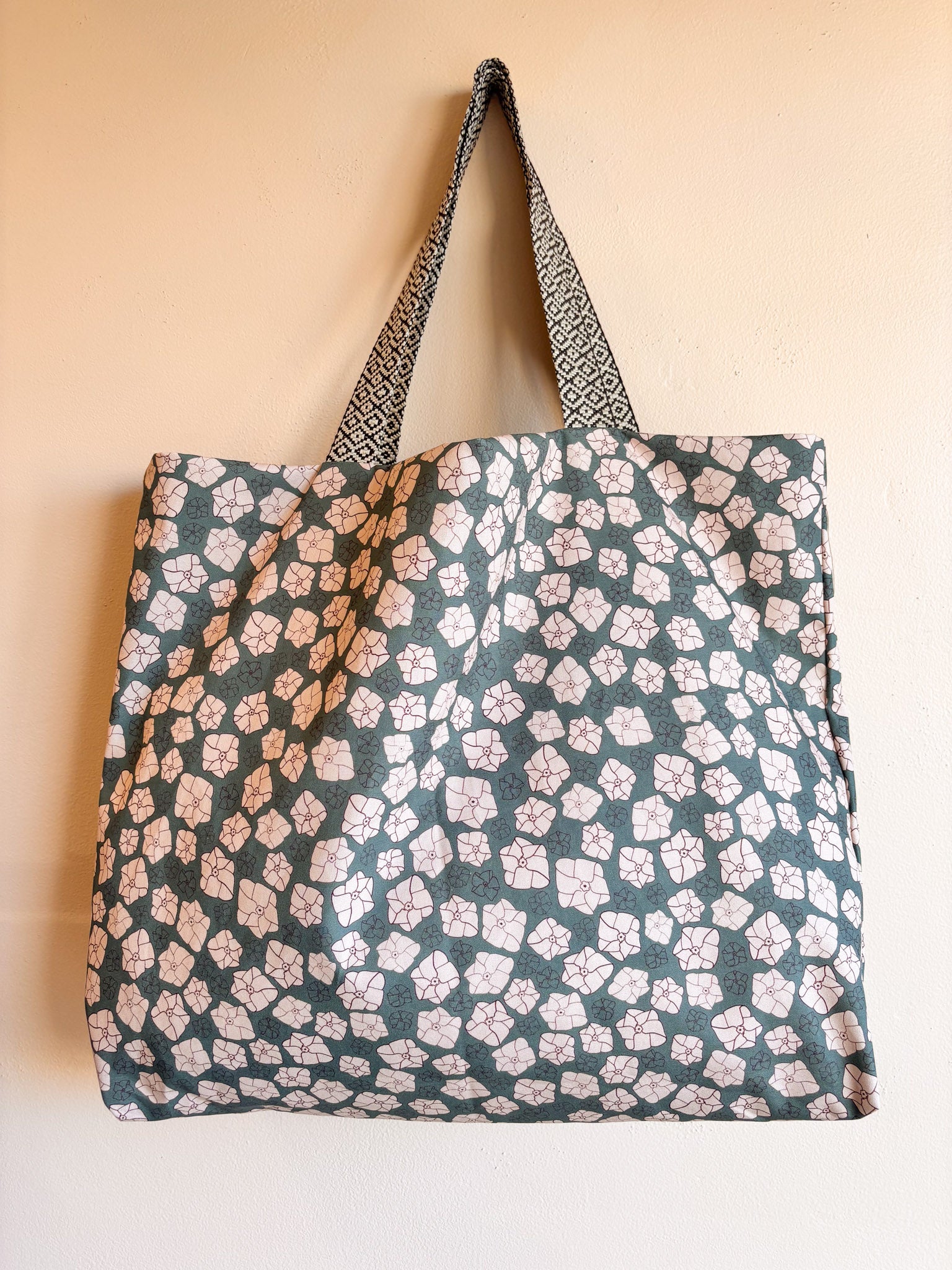 Simple, fun, and extra big reversible tote in cotton canvas. Single, large pocket with poly-cotton jacquard webbing.