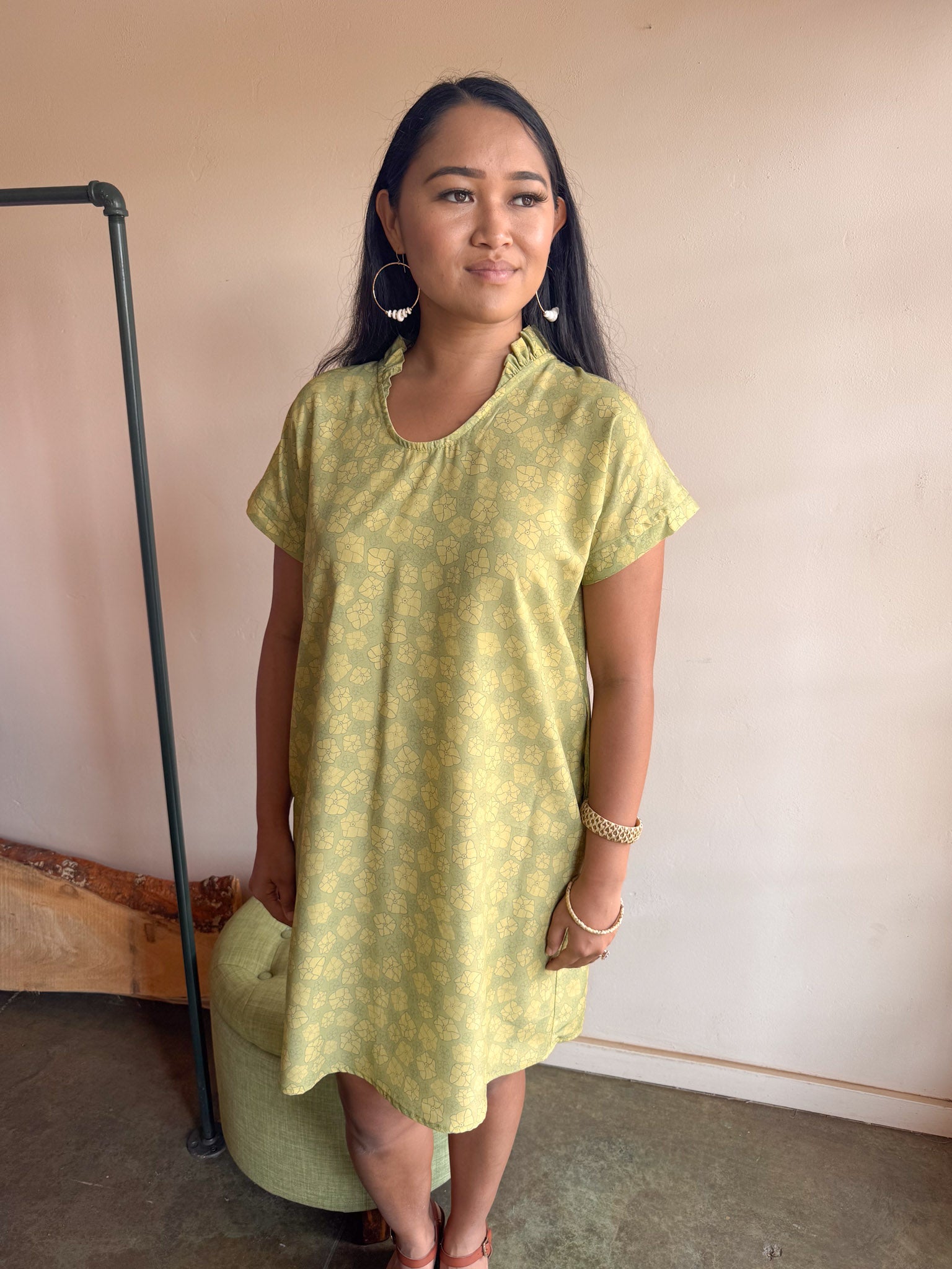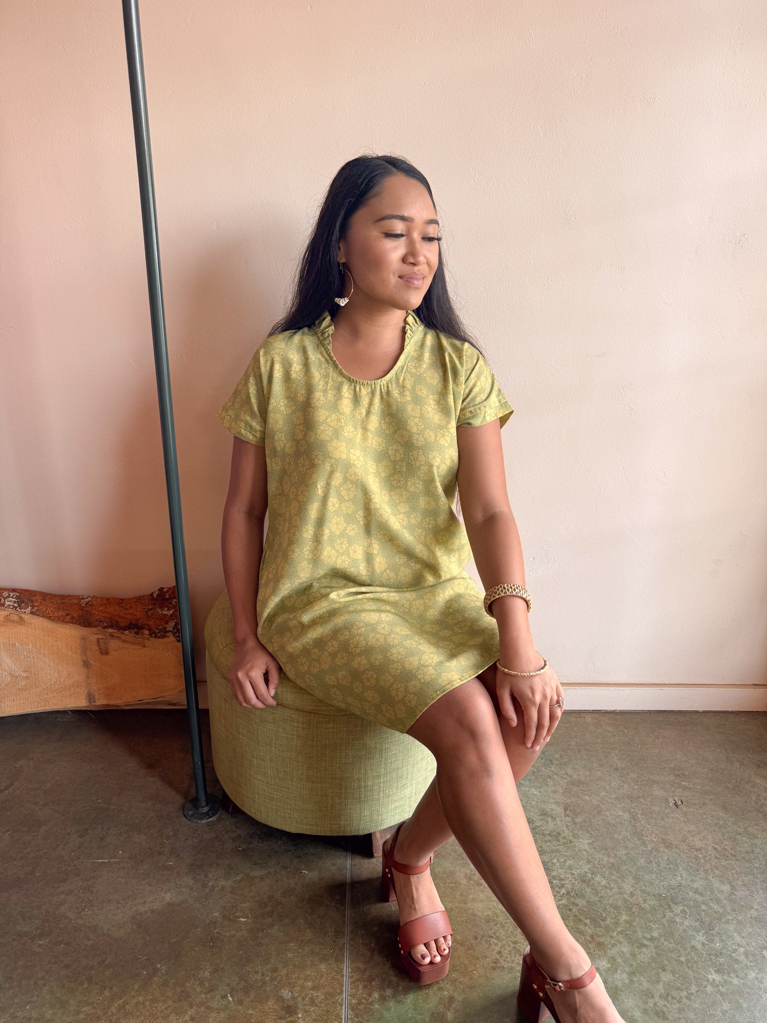 Updated this style with a little more ruffle in our Hala print. The Pua Muʻu Mini is an above the knee length modern muʻumuʻu style with a shorter, banded sleeve.