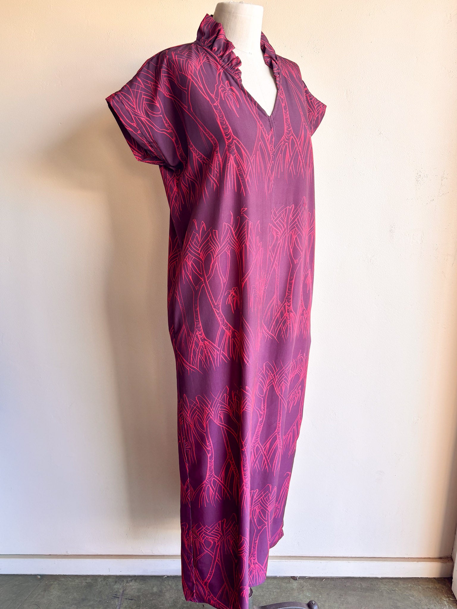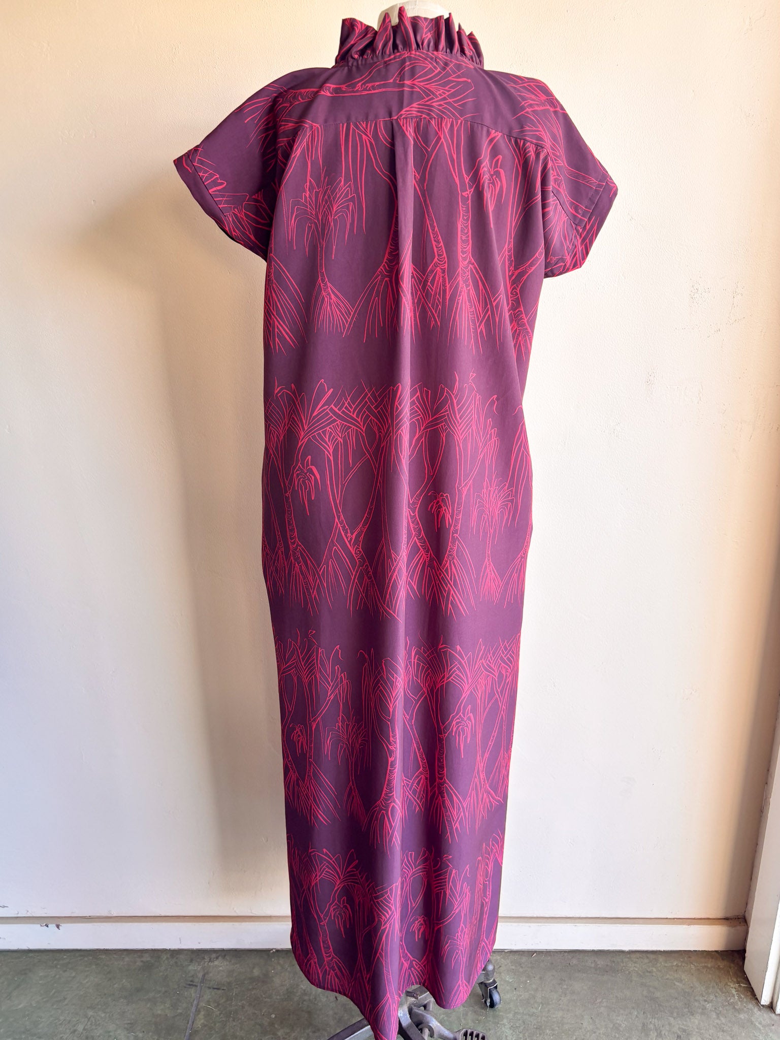 A roomy, signature- ruffled collar cut to love. The Pua Muʻu is a full length modern muʻumuʻu style with a shorter, capped sleeve, yoke at back, and center front slit.