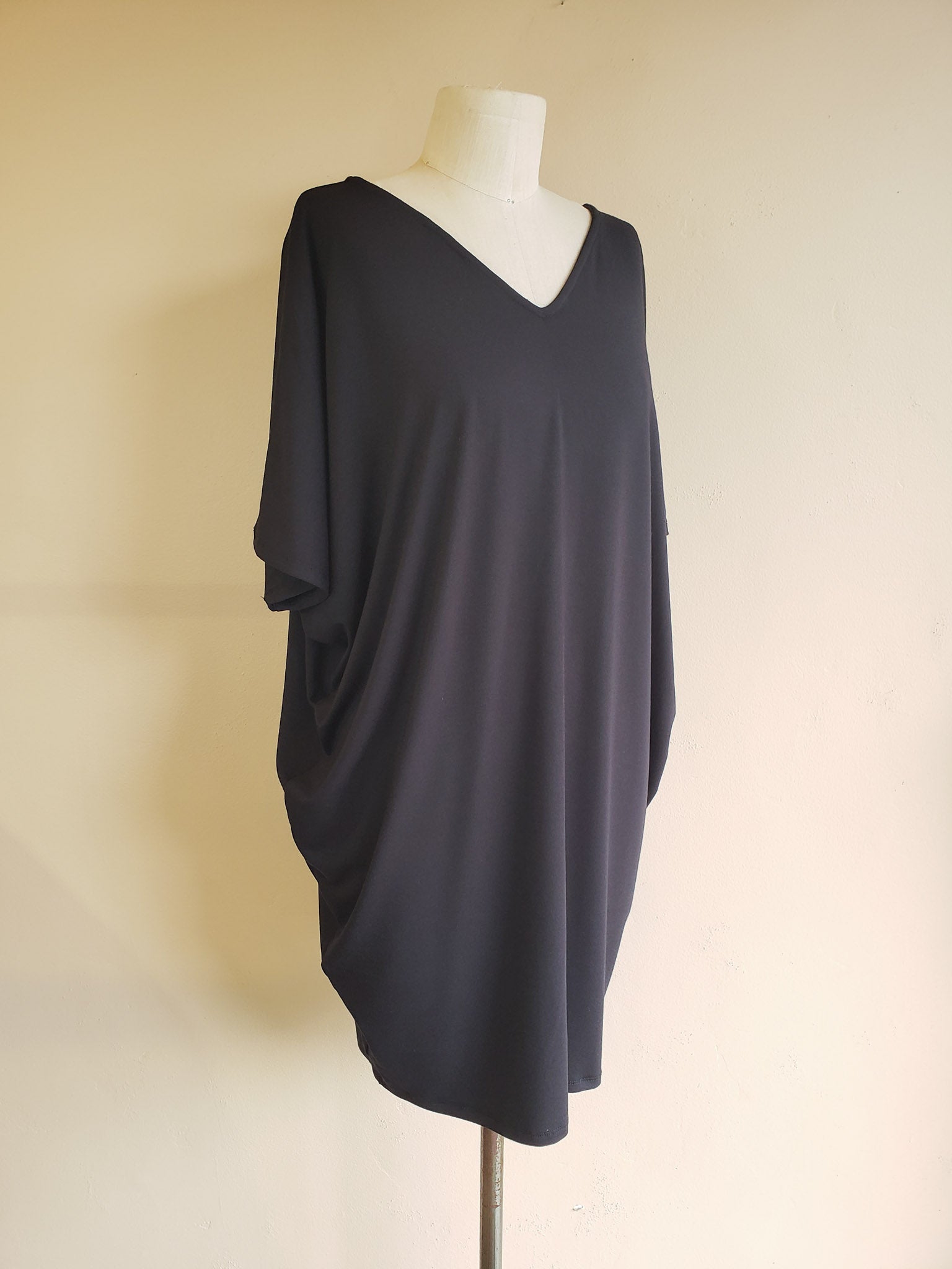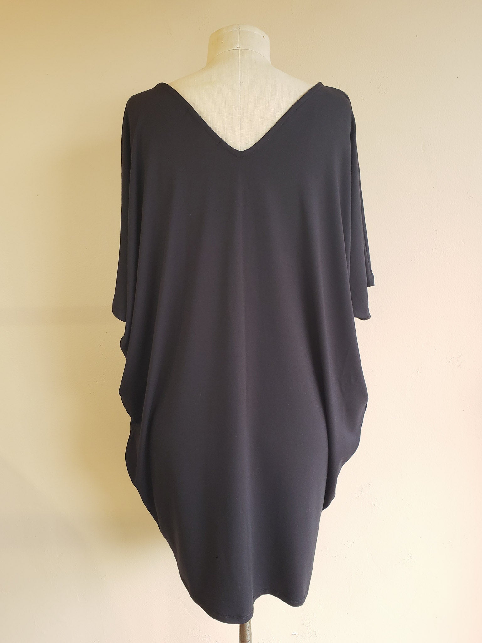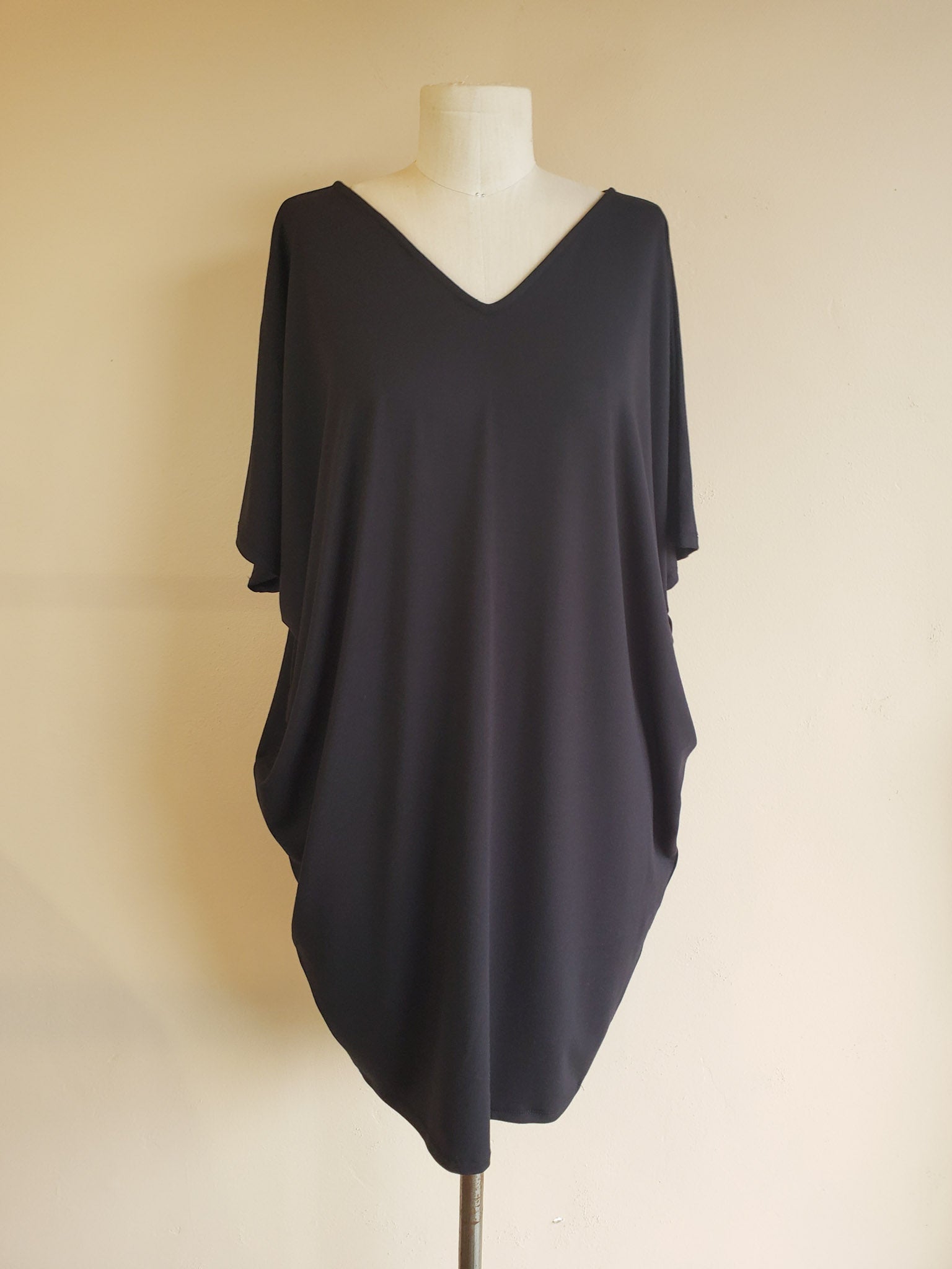 One of our original Kūlua styles and everyone's favorite dress. Wear it for day with your favorite slippers then switch up your accessories for a night out. So comfortable, easy, and sophisticated with the perfect amount of drape. Classic cut in a mini length with a “V” in the front, a “V” in the back, and a half length sleeve. S/M Length ~35" Also available in Regular and Midi length.