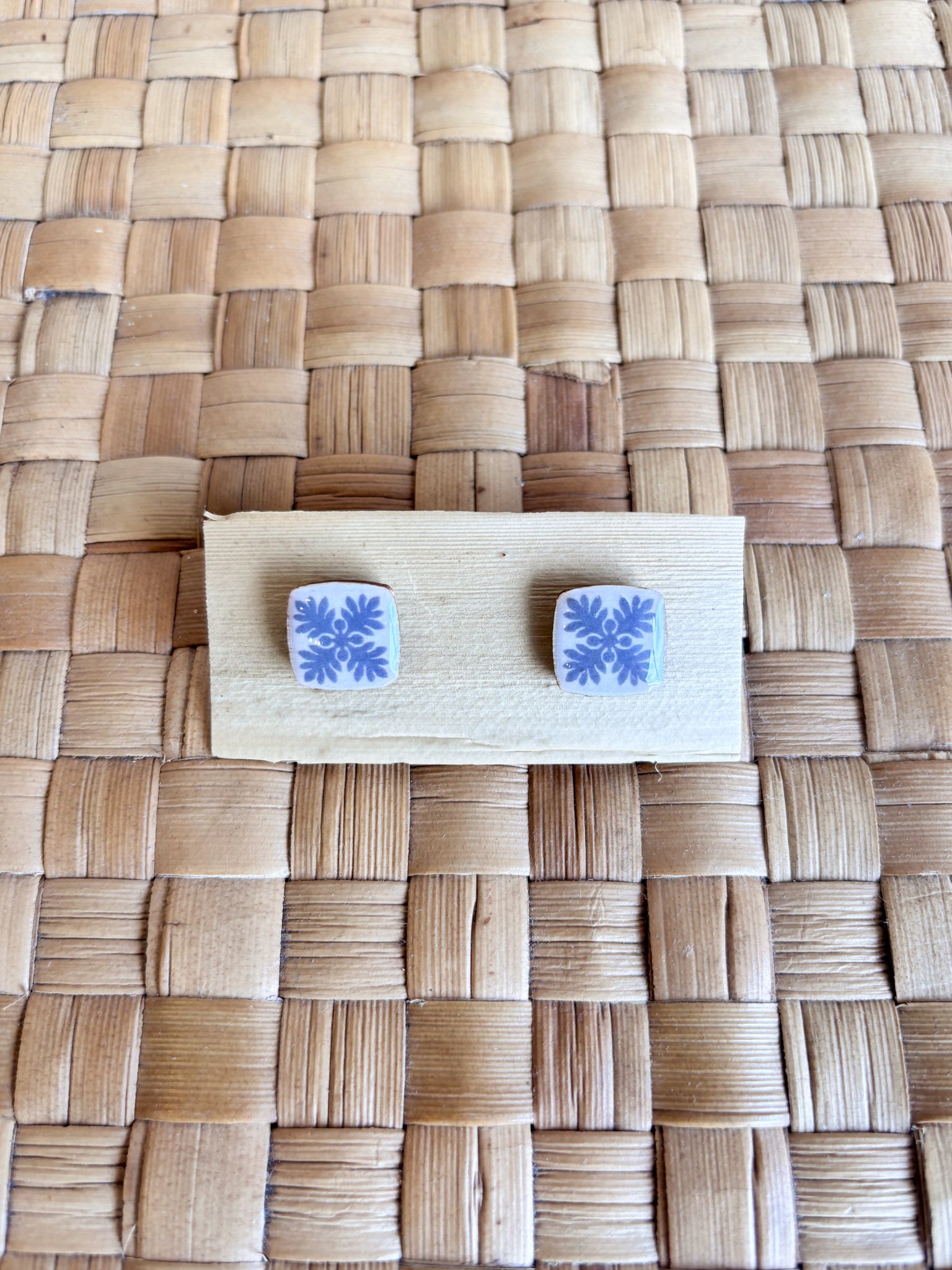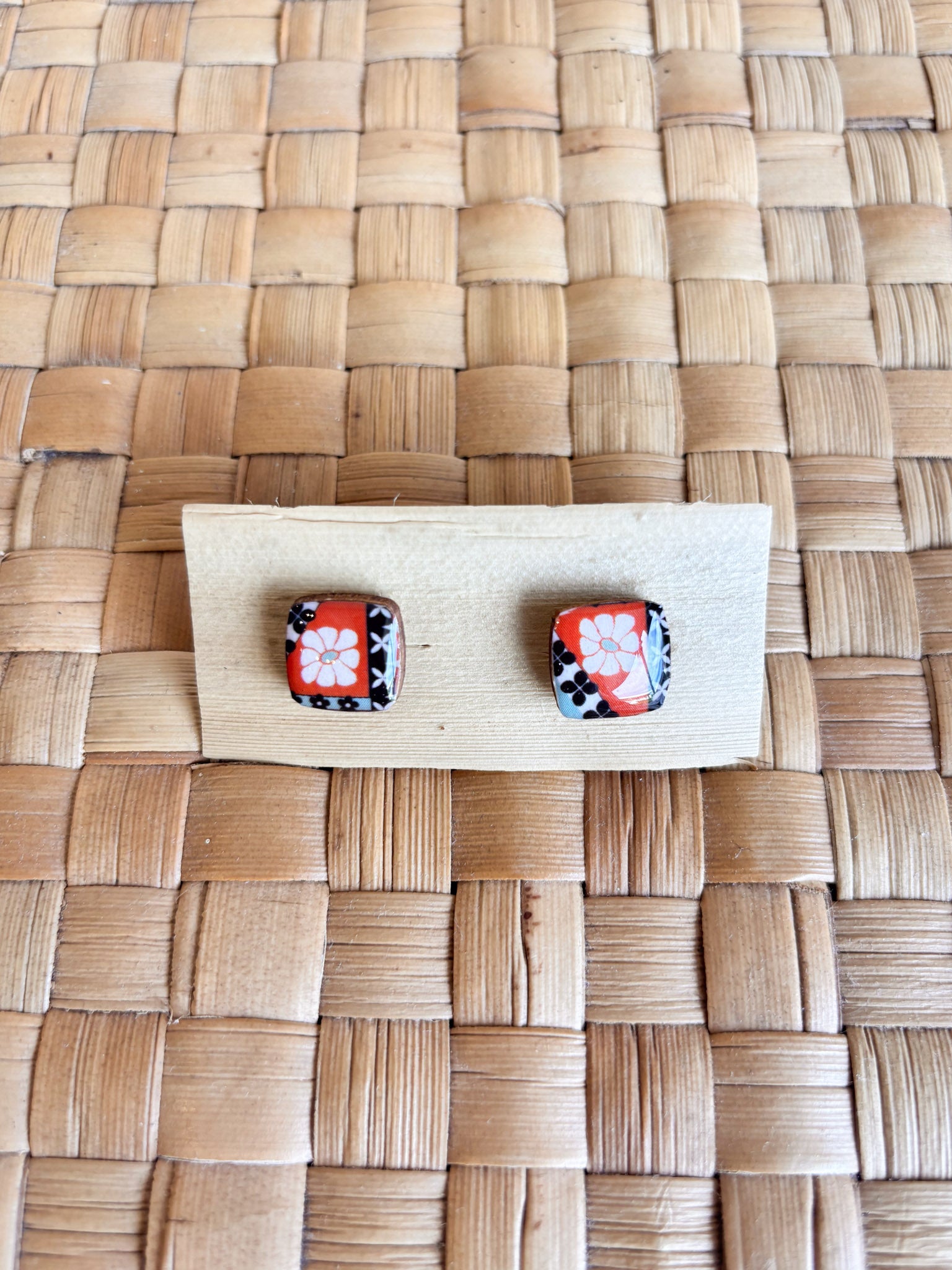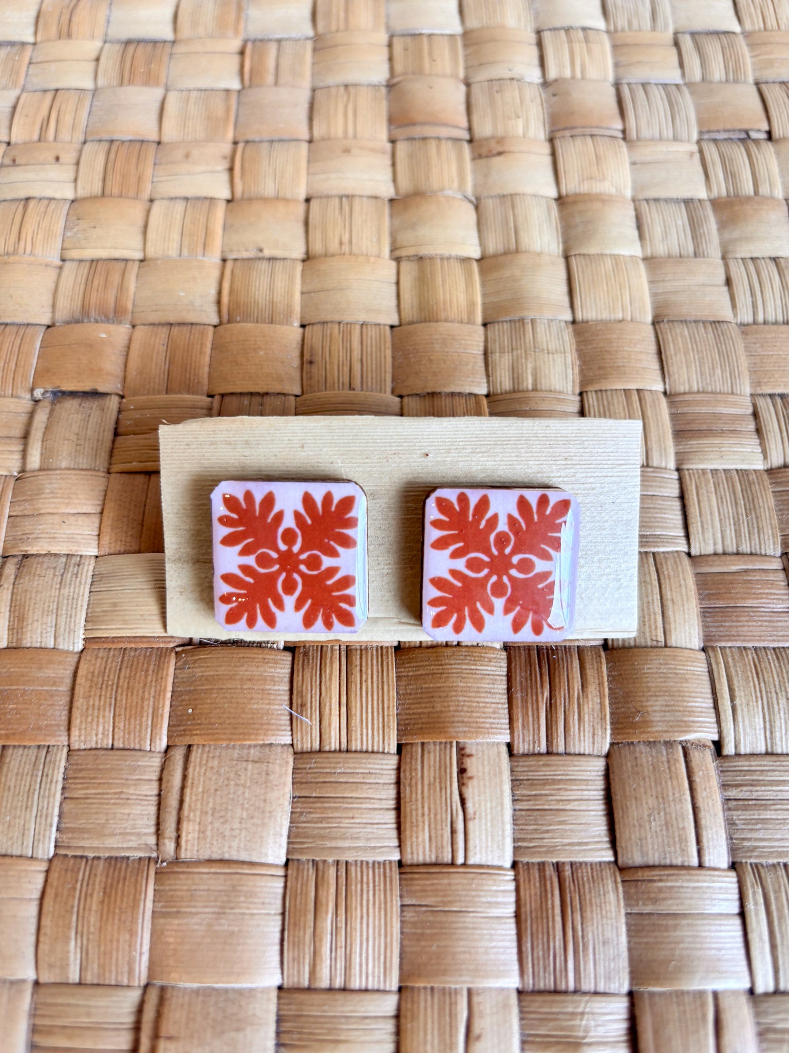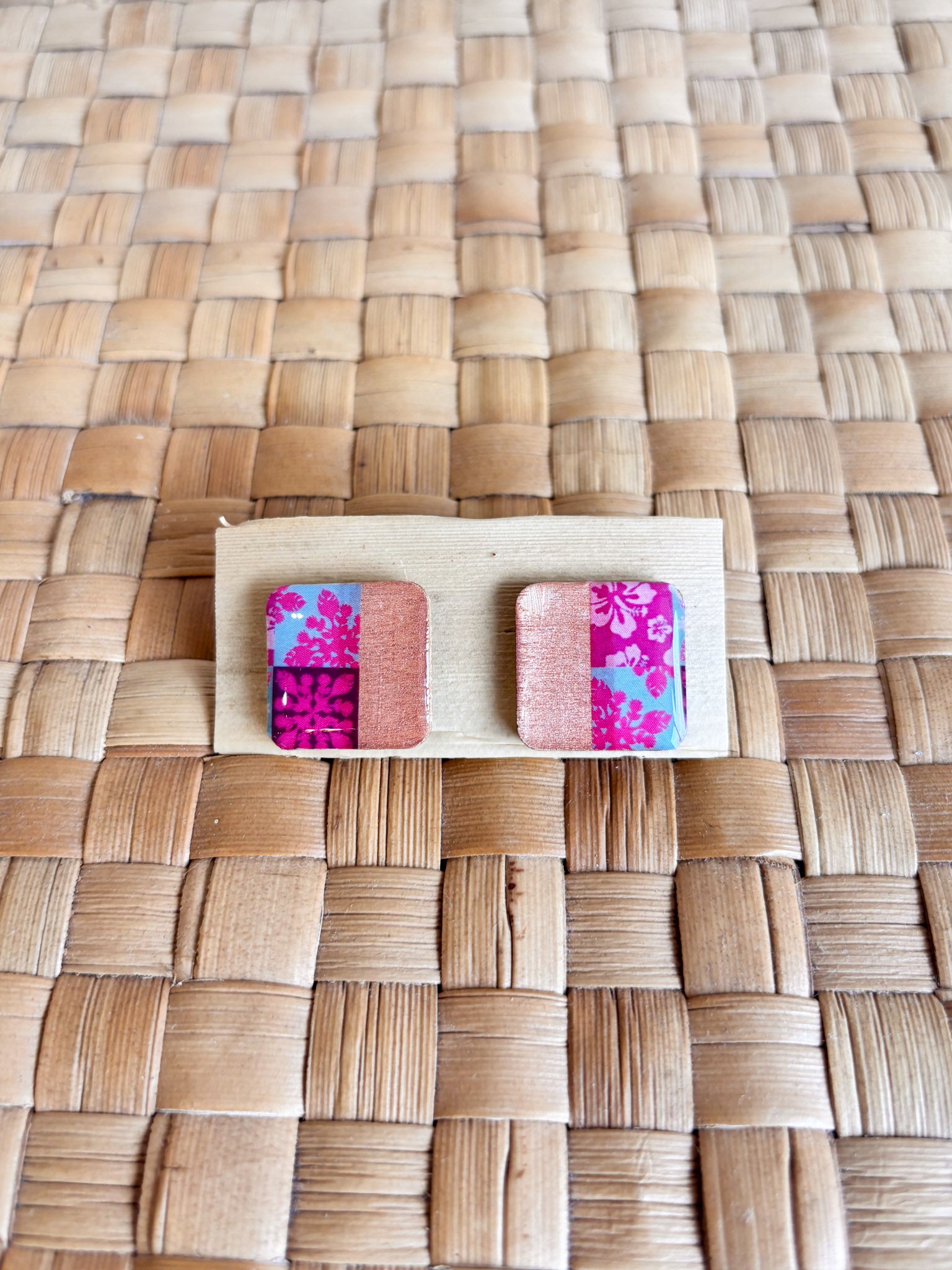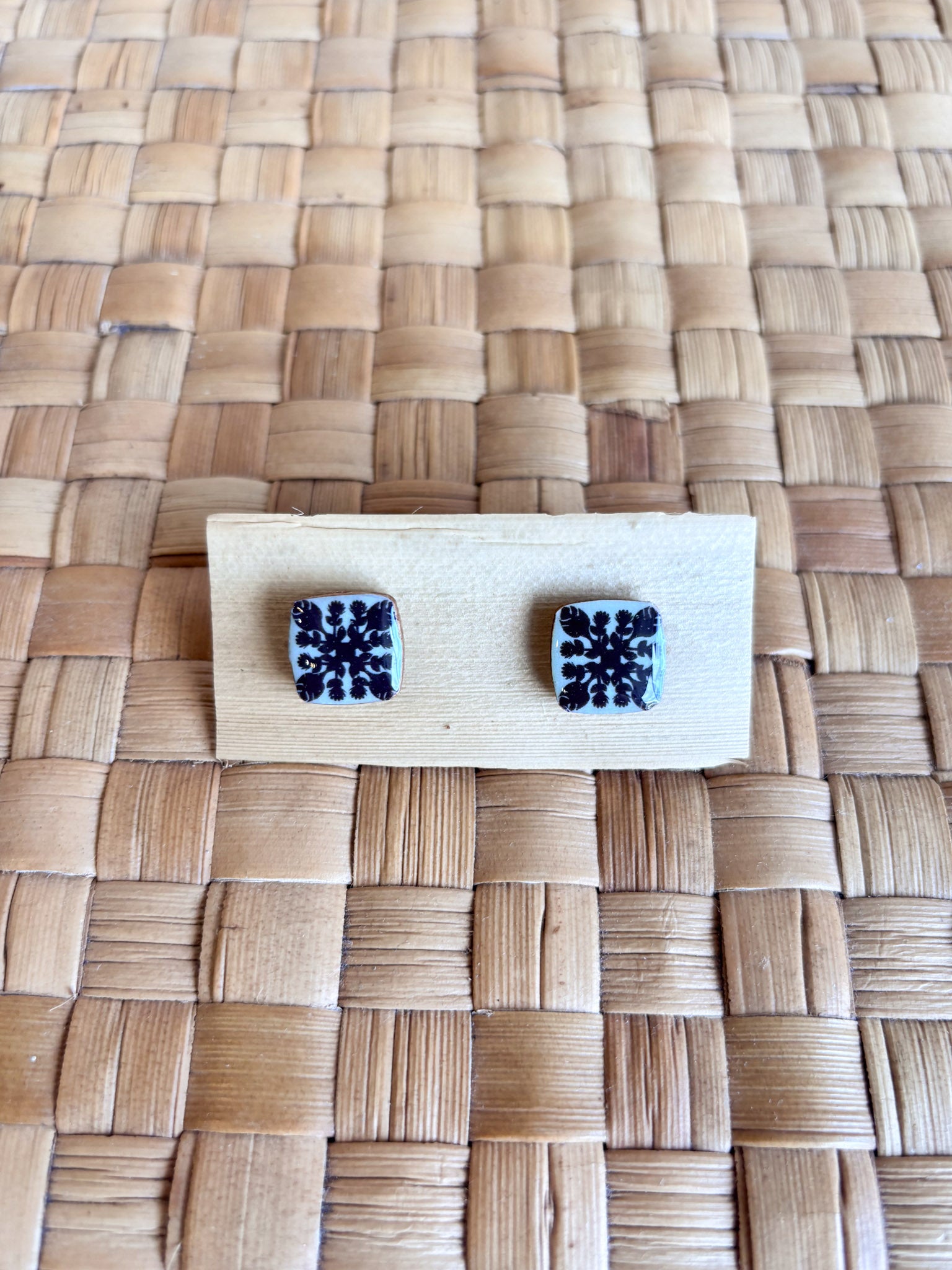 These wood/resin mix earrings are created by Nannette Lara of Musubee. Inspired by vintage muʻumuʻu prints, her motifs include popular quilt patterns and lei. Available in Petite 1/2" squares, 1" squares, and a 1" dangle.
