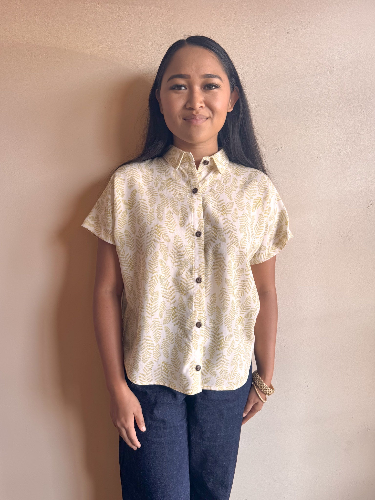 A dolman sleeve cut wahine aloha shirt thatʻs comfortable with the perfect amount of feminine drape. Collar stand and collar with a lightly curved hem. Length to the hip. Real coconut buttons.