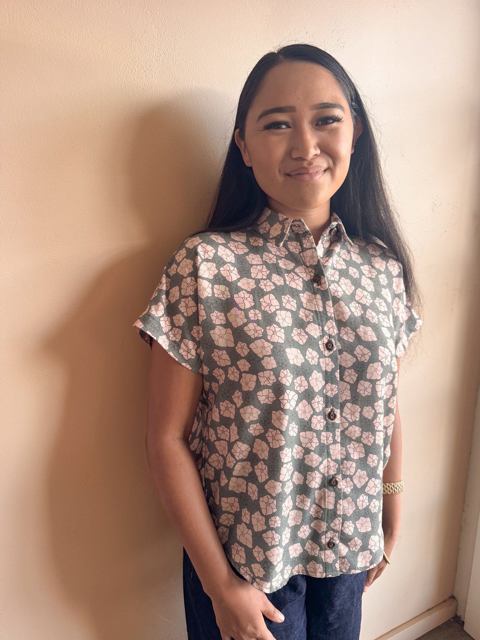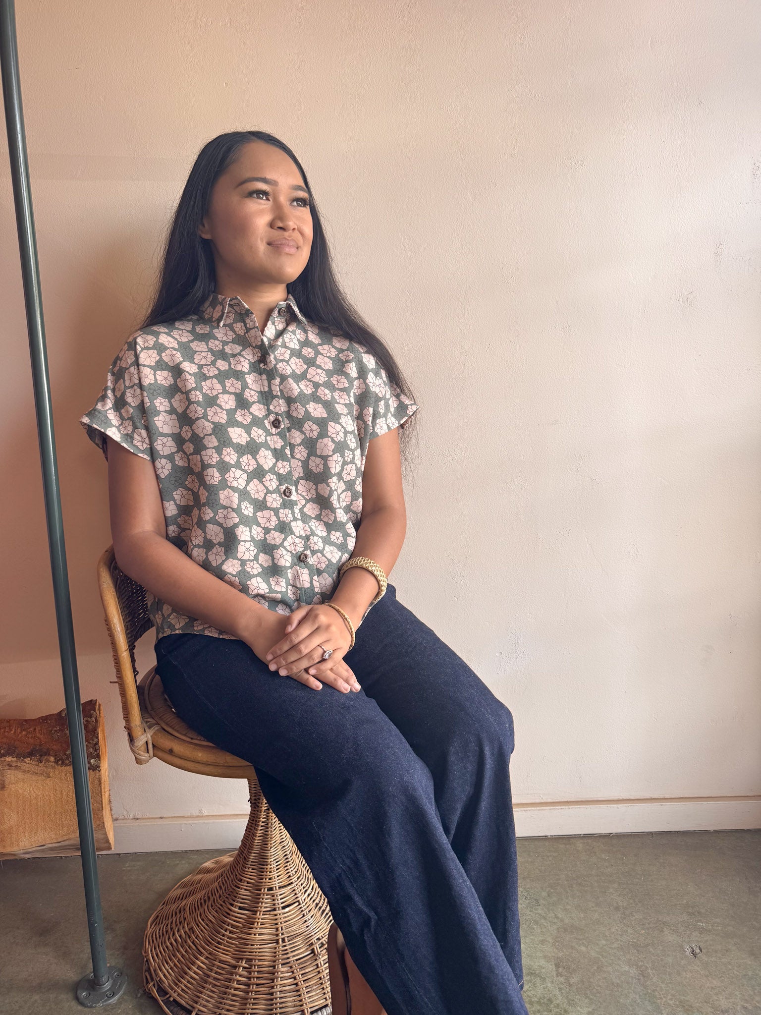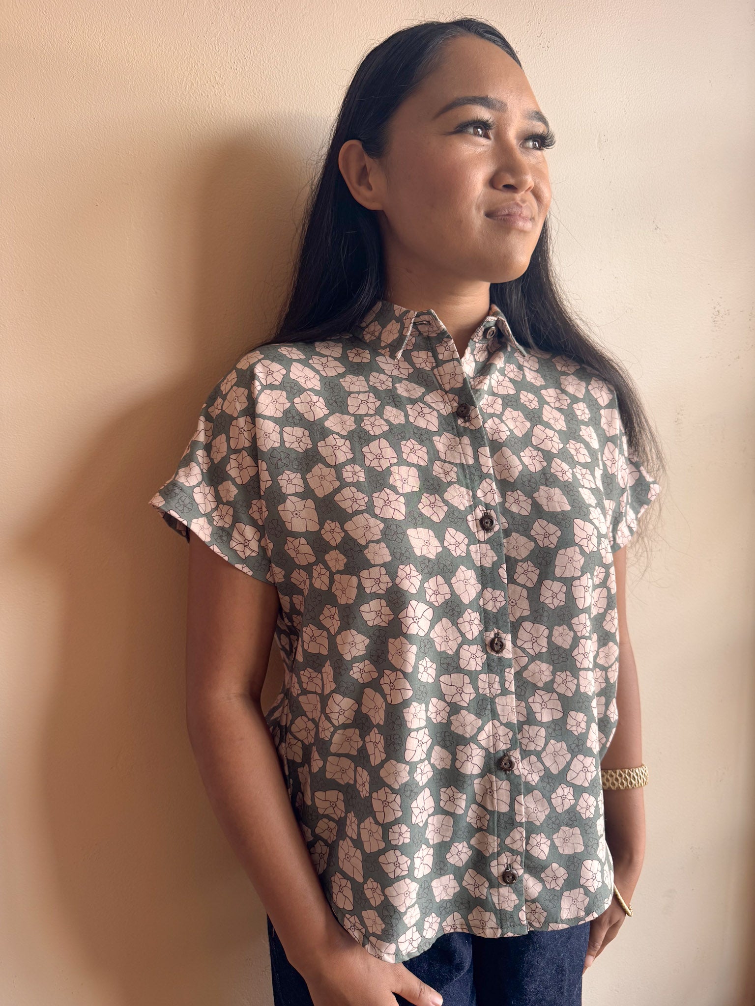 A dolman sleeve cut wahine aloha shirt thatʻs comfortable with the perfect amount of feminine drape. Collar stand and collar with a lightly curved hem. Length to the hip. Real coconut buttons.